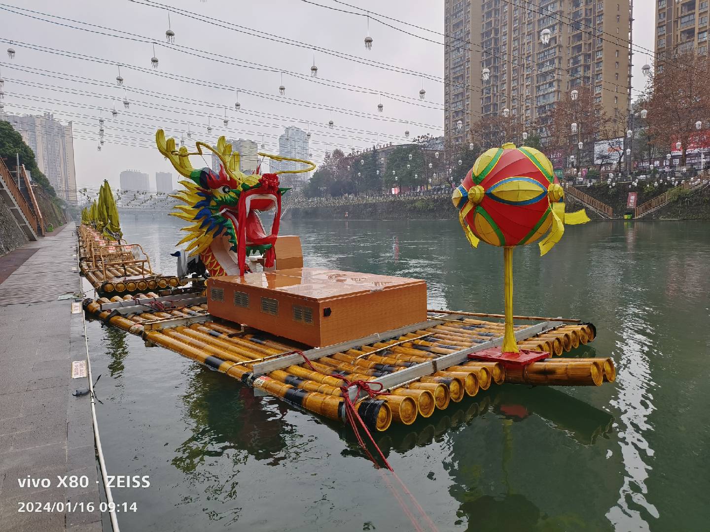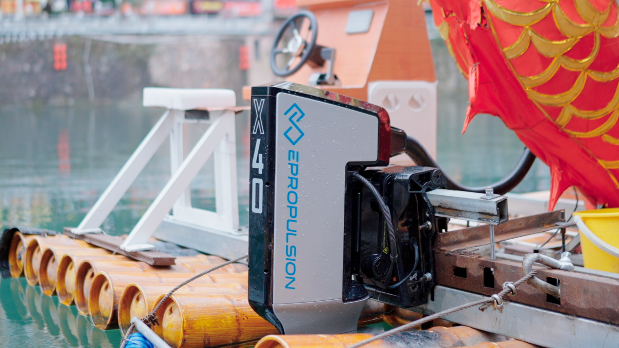 This 2024 Bamboo Dragon Raft is an electric Raft powered by a 40 kW ePropulsion motor and a 72 kWh battery pack, offering a quiet and eco-friendly boating experience.