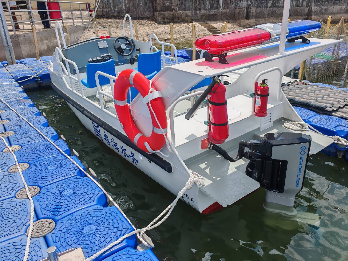 This 2025 Shenzhen Water Affairs Custom is an electric Motorboat powered by a 20 kW ePropulsion motor and a 20 kWh battery pack, offering a quiet and eco-friendly boating experience.