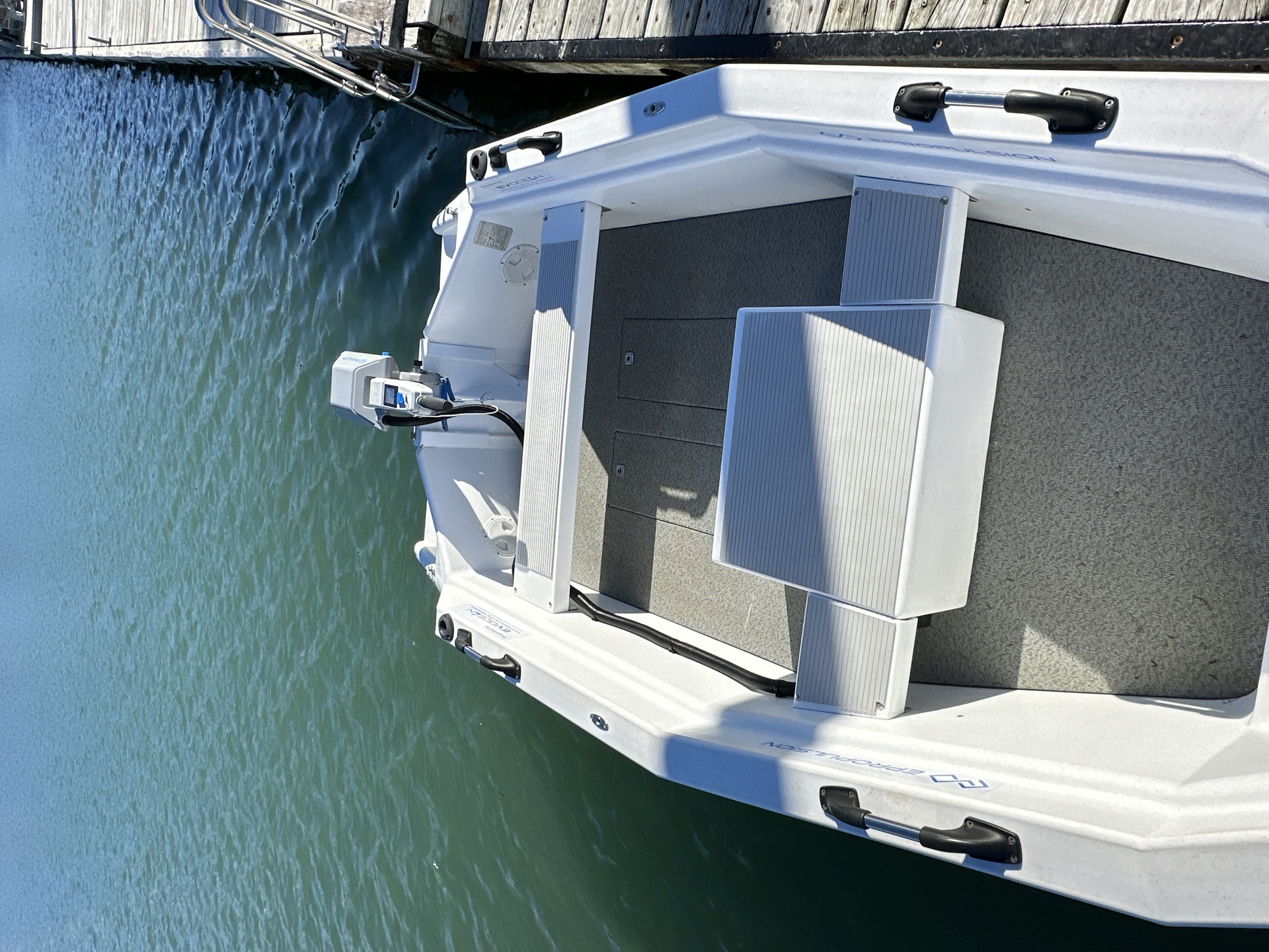This 2021 Mac 360 is an electric Utility Boat from Mac Boats, powered by a 3 kW ePropulsion motor and a 4 kWh battery pack, offering a quiet and eco-friendly boating experience.