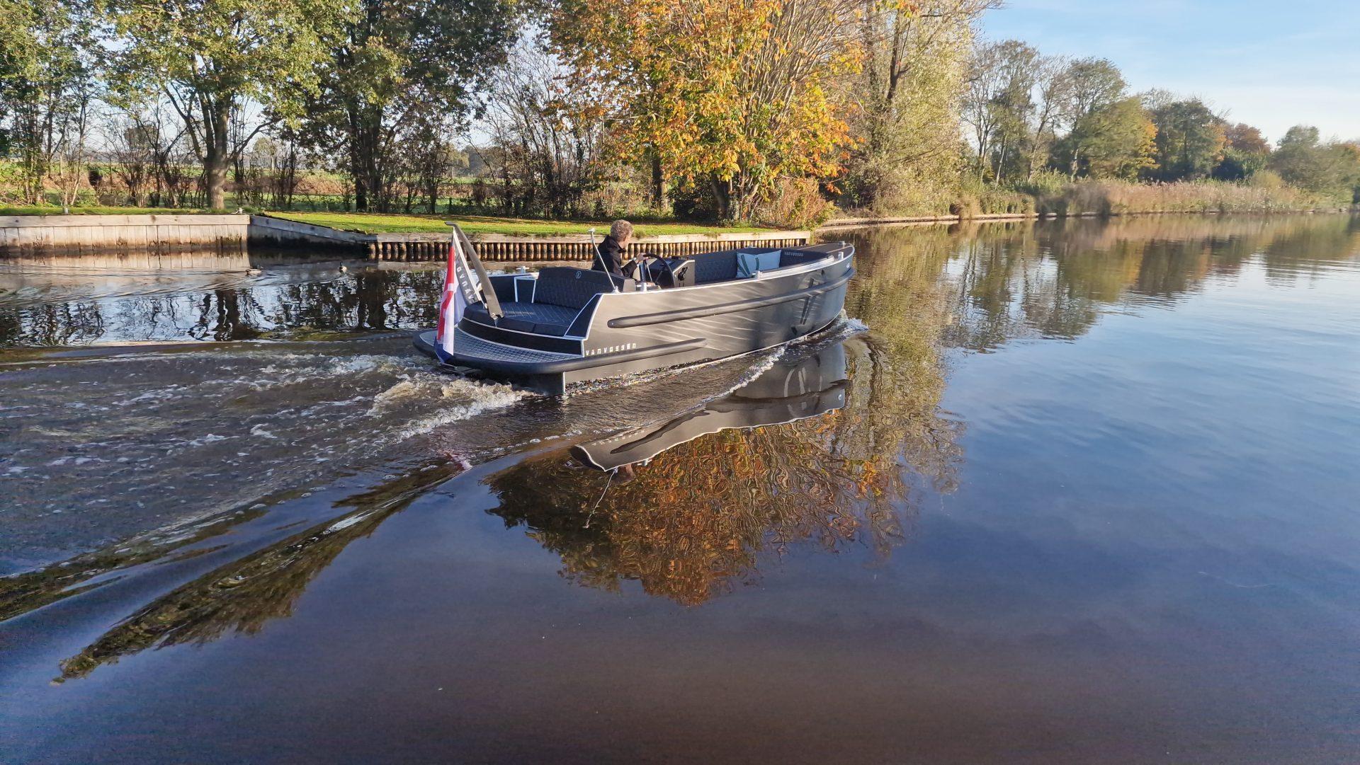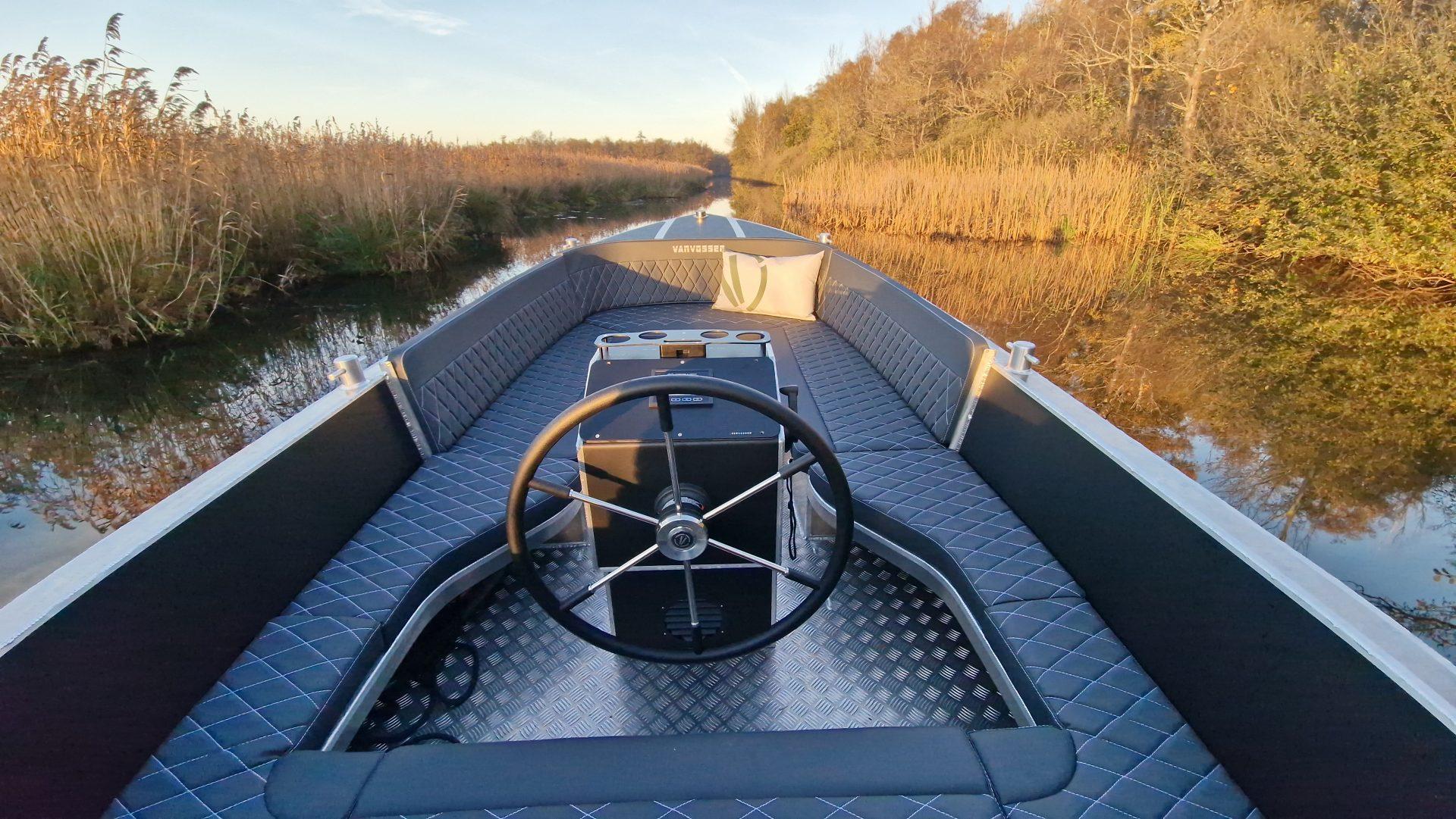 This 2025 E-Tender 650 is an electric Passenger Vessel from Van Vossen, powered by a 12 kW ePropulsion motor and a 10 kWh battery pack, offering a quiet and eco-friendly boating experience.