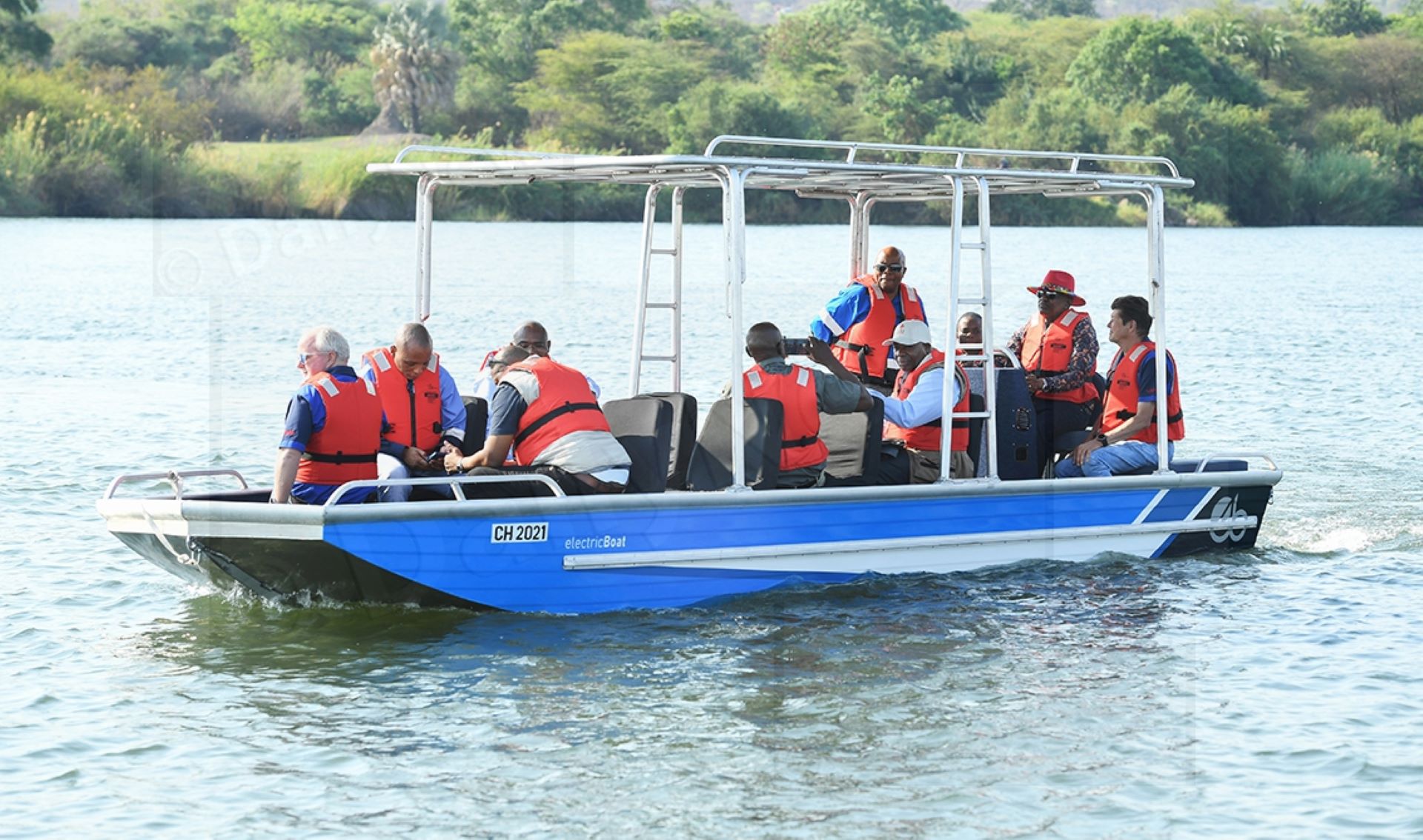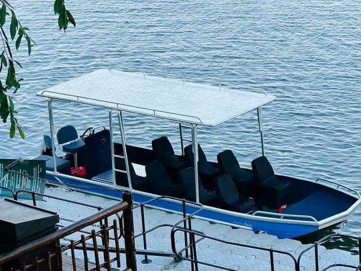 This 2024 Swamp Cruiser 7m is an electric Utility Boat from Aliboats, powered by a 40 kW ePropulsion motor and a 200 kWh battery pack, offering a quiet and eco-friendly boating experience.