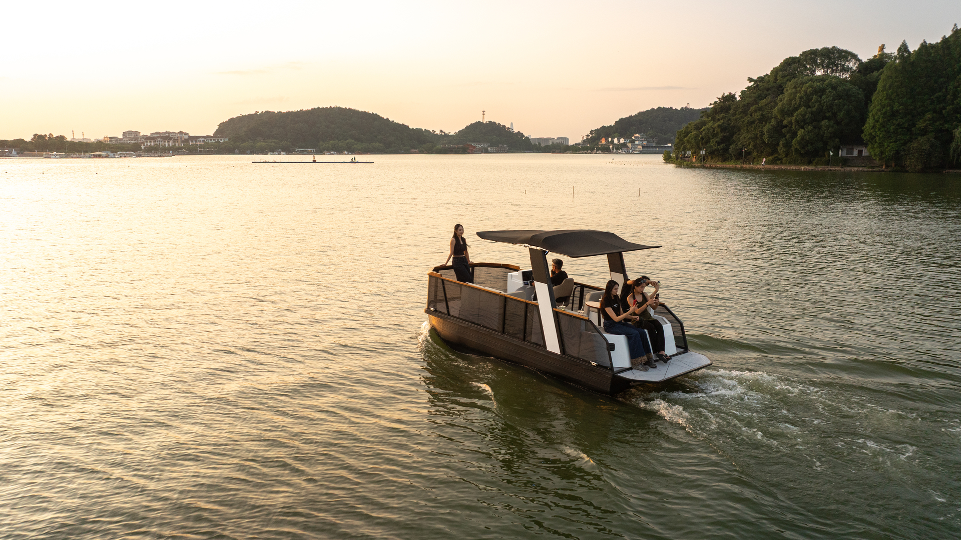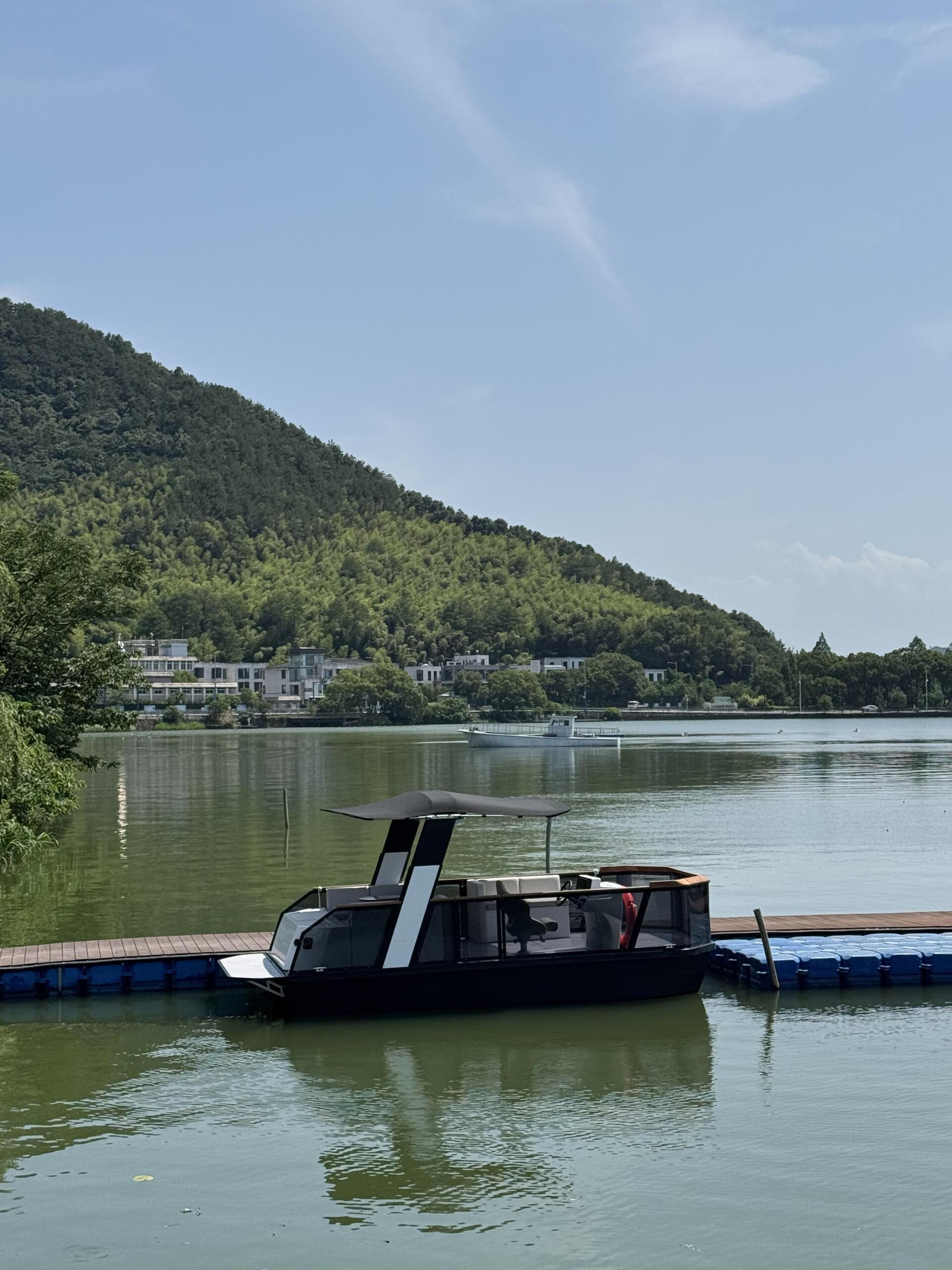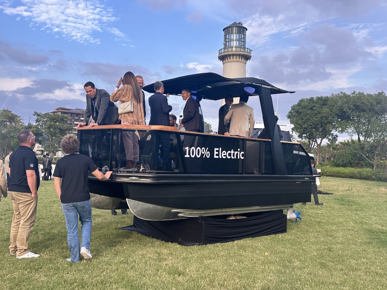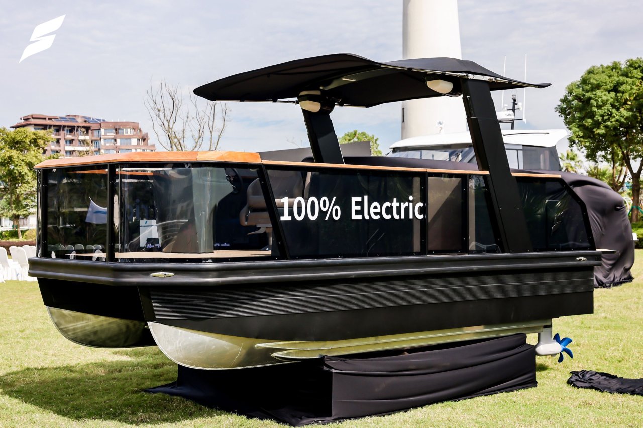 This 2025 Nova Air is an electric Pontoon from XingYuFan NingBo, powered by a 24 kW ePropulsion motor and a 47 kWh battery pack, offering a quiet and eco-friendly boating experience.