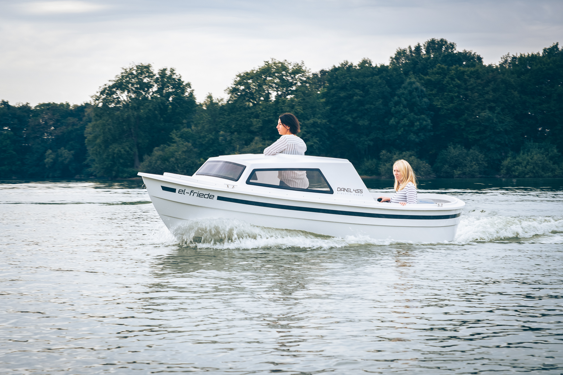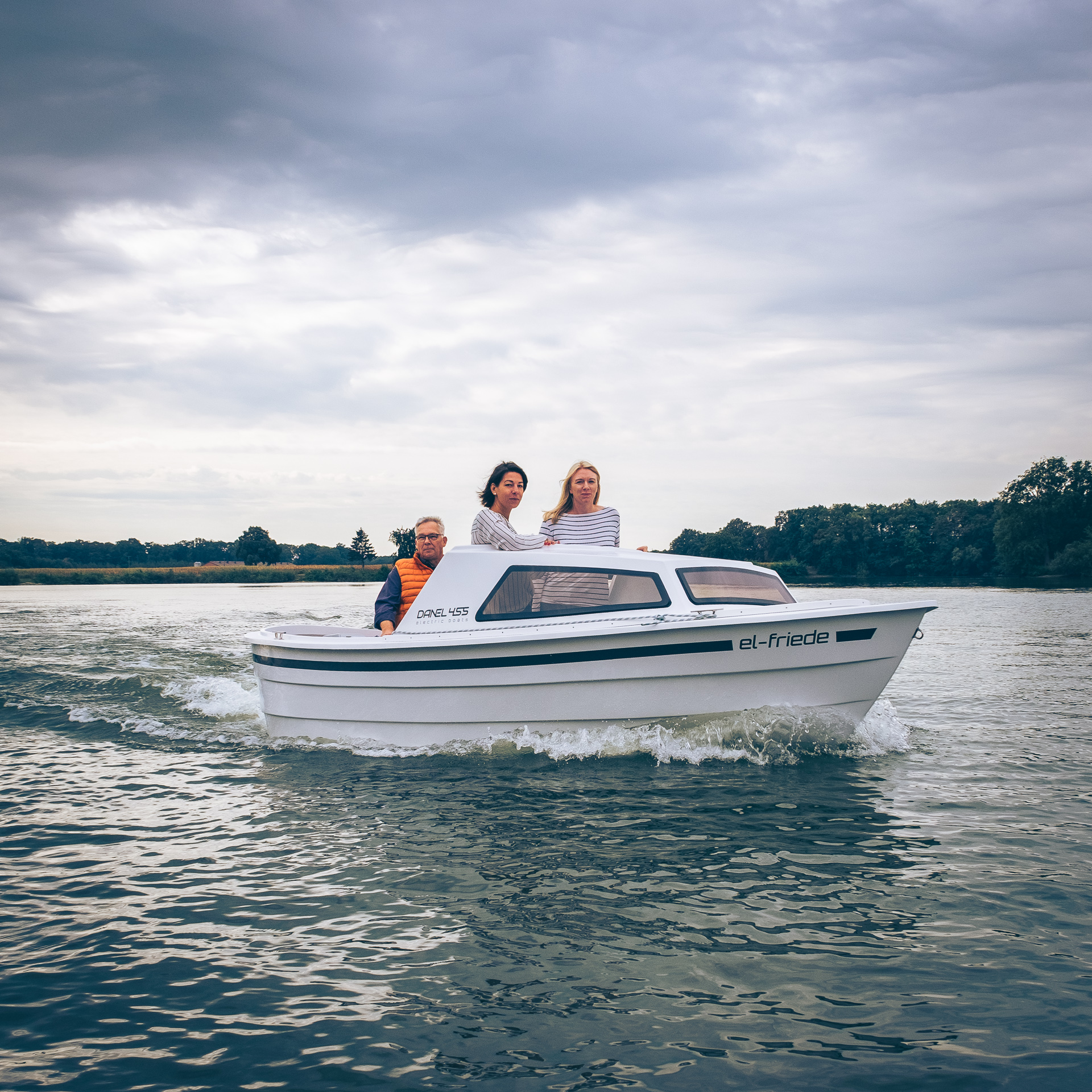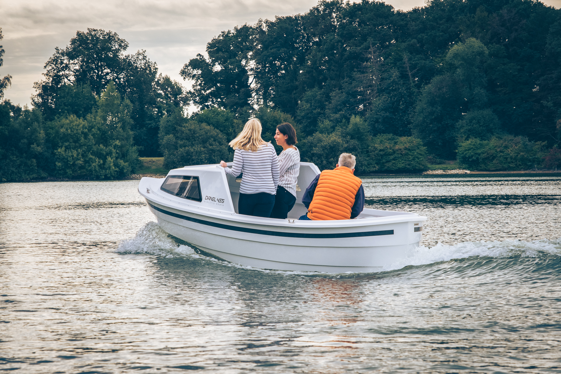 This 2021 455 is an electric Motorboat from Danel, powered by a 6 kW ePropulsion motor and a 9 kWh battery pack, offering a quiet and eco-friendly boating experience.
