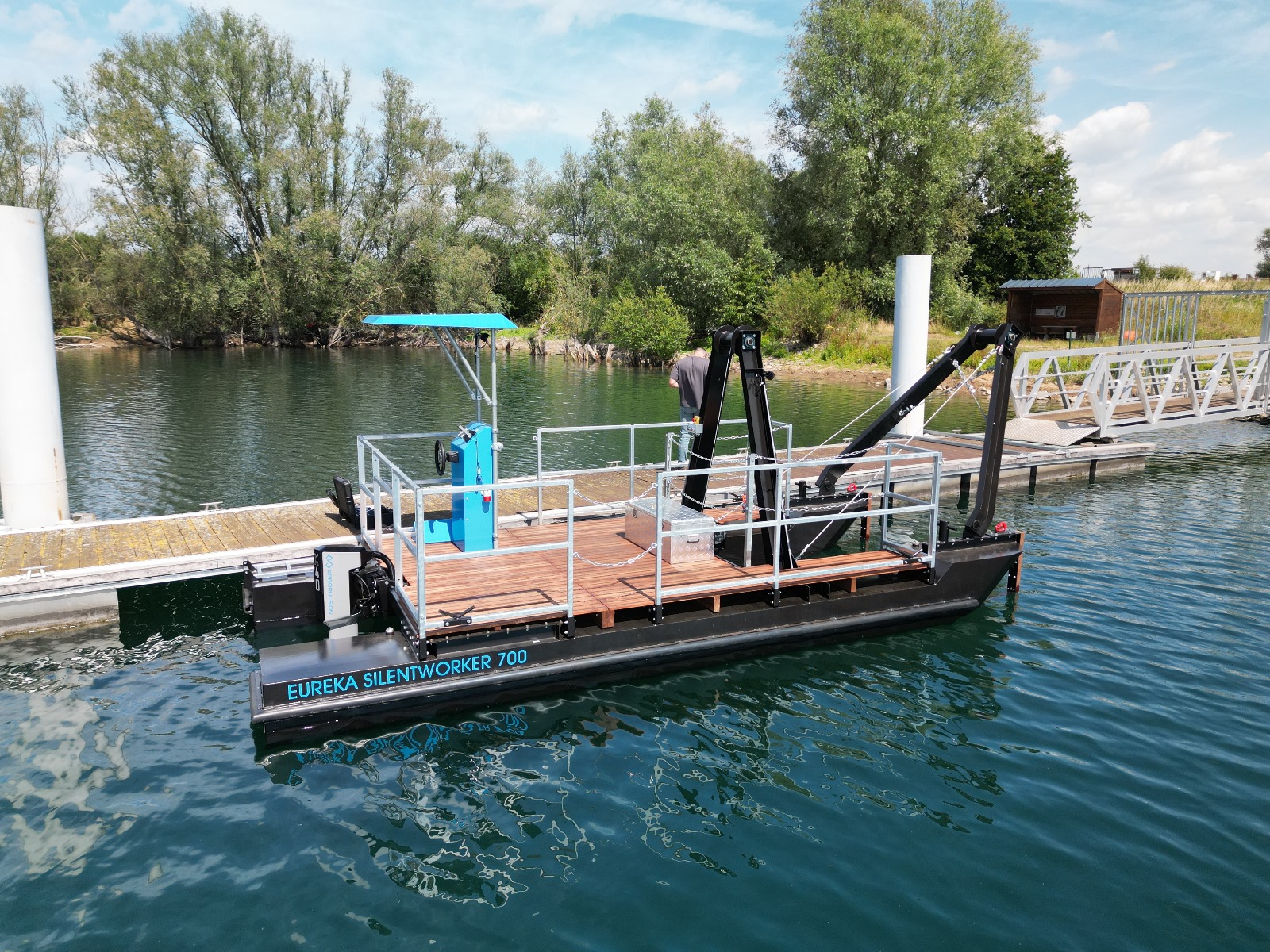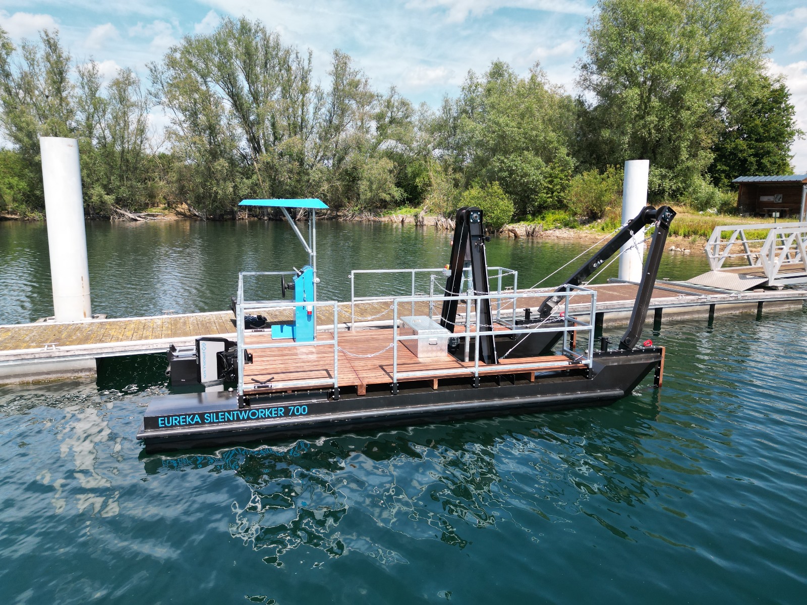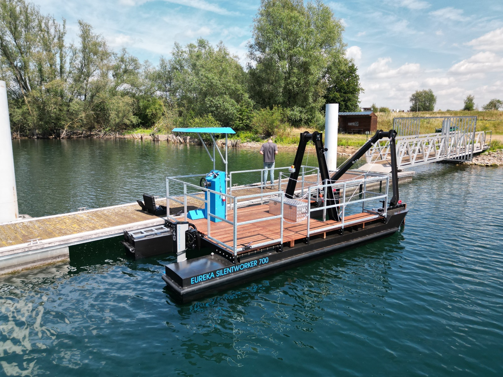This 2025 Silentworker 700 is an electric Dredger from EUREKA, powered by a 40 kW ePropulsion motor and a 94 kWh battery pack, offering a quiet and eco-friendly boating experience.
