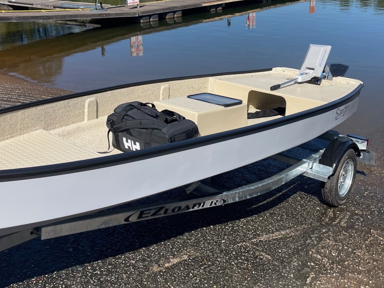 This 2025 160 Tiller Steer is an electric Fishing boat from Santee, powered by a 6 kW ePropulsion motor and a 6 kWh battery pack, offering a quiet and eco-friendly boating experience.