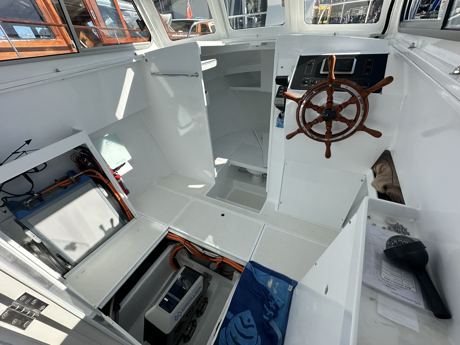This 1978 Custom is an electric Utility Boat from Homebuilt, powered by a 10 kW ePropulsion motor and a 20 kWh battery pack, offering a quiet and eco-friendly boating experience.