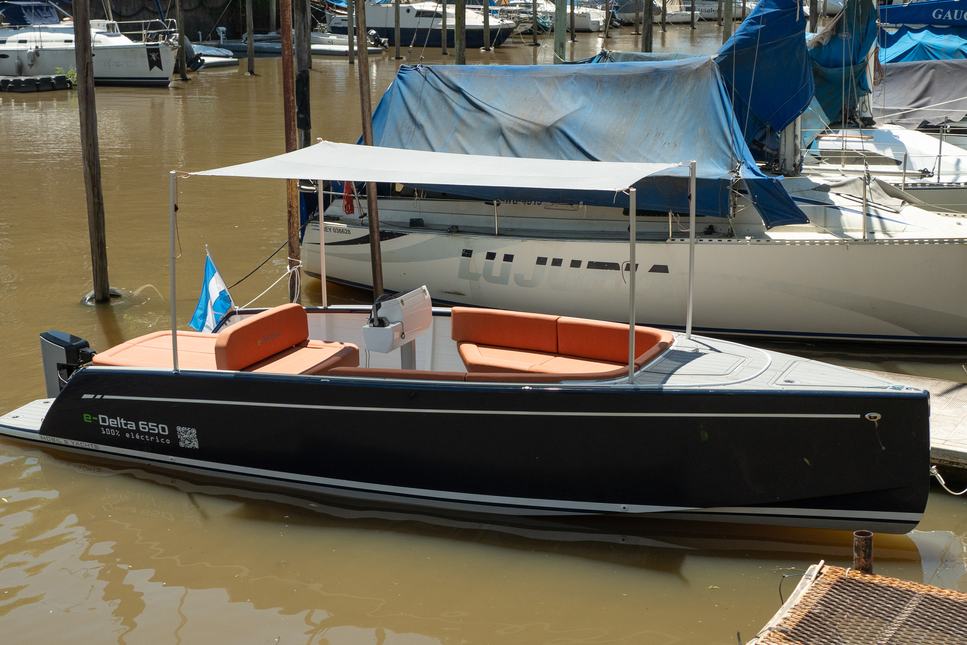 This 2025 e-Delta 650 is an electric Pleasure boat from Mobilis Yachts, powered by a 40 kW ePropulsion motor and a 20 kWh battery pack, offering a quiet and eco-friendly boating experience.