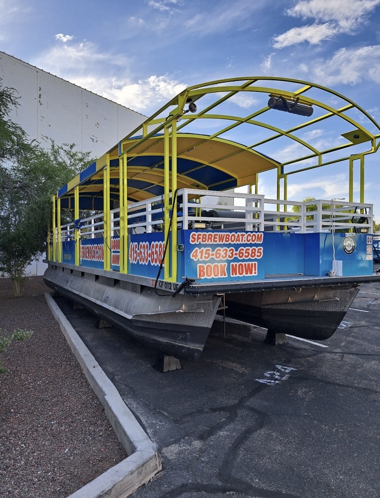 This 2021 Paddle Pub is an electric Pontoon from Trident, powered by a 20 kW ePropulsion motor and a 41 kWh battery pack, offering a quiet and eco-friendly boating experience.