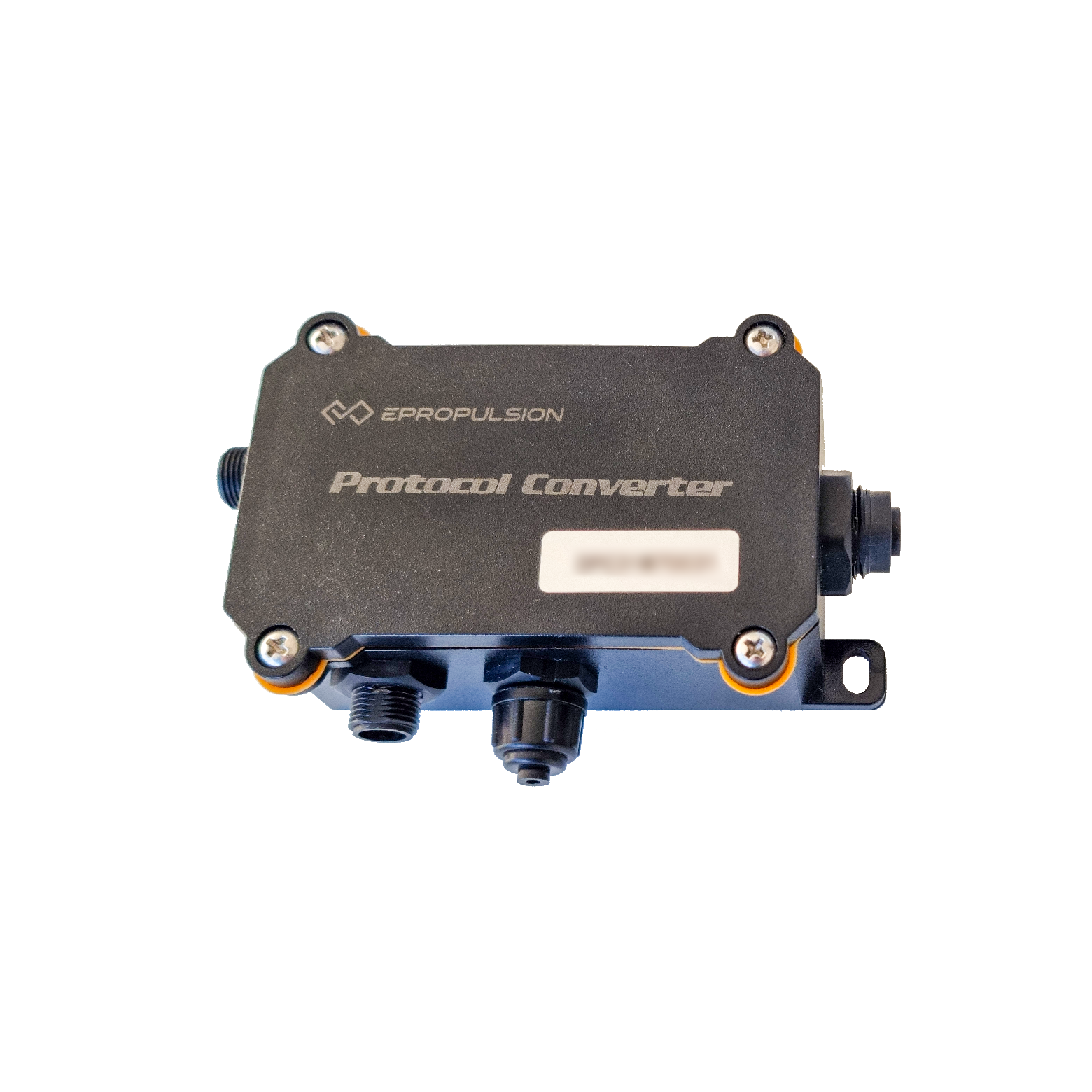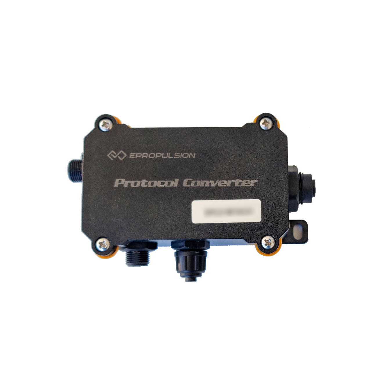 The protocol converter is designed for external systems to control N series outboards by initiating and halting operation, adjusting speed, and displaying system information. Equipped with three RS485 interfaces, the protocol converter can simultaneously support connections for up to two N series outboards. It communicates with the built-in communication systems of the outboards through wired connections, and it can automatically detect and connect to all models of ePropulsion N series outboards. Users can conveniently manage the converter through either software settings or serial port commands on a PC.
